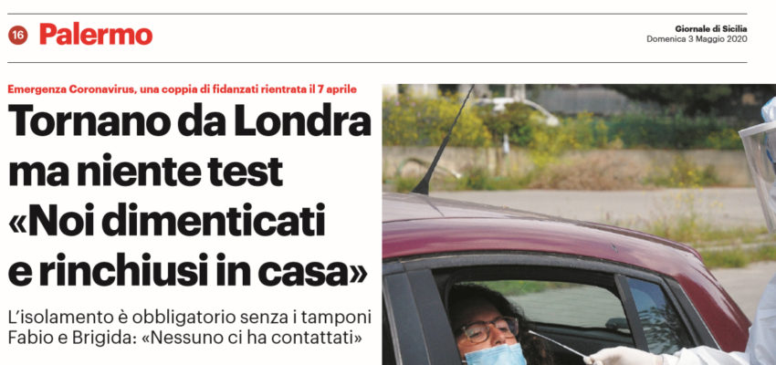 L’edizione odierna del “Giornale di Sicilia” racconta la vicenda di una coppia palermitana, rientrata da Londra il 7 aprile, ancora in attesa di essere sottoposta a test per essere liberati dalla “reclusione” domiciliare che poteva finire lo scorso 21 aprile: «Noi abbiamo contattato tanti numeri dell’Asp per avere informazioni, ma molti non funzionano o non rispondono e quando riusciamo a parlare con qualcuno ci dicono che non possono fare niente. Ci hanno anche fornito un indirizzo email dell’Asp ma, da quando sono passate le due settimane obbligatorie di isolamento, abbiamo rispettivamente scritto cinque volte a questo indirizzo fornendo loro le nostre generalità, la data di rientro in Italia e chiedendo informazioni sui tamponi. Non abbiamo purtroppo ancora ricevuto nessuna risposta».