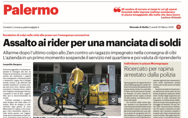 L’edizione odierna del “Giornale di Sicilia” si sofferma sui furti e colpi vari a Palermo, nel bel mezzo dell’emergenza Coronavirus. Sabato, un rider di “Zangaloro meat factory”, è stato aggredito allo Zen: chiedendo informazioni sul domicilio che cercava, è stato affrontato da un bandito che si è fatto consegnare 80 euro, incasso della serata. Il locale ha annunciato la sospensione delle consegne nel quartiere, ma nella giornata di ieri ha ridimensionato il messaggio: «Ci teniamo a ringraziarvi per i tanti messaggi di solidarietà nei nostri confronti e soprattutto nei confronti del ragazzo. Ma vogliamo soprattutto scusarci con tutta la gente che popola il quartiere Zen, che è anche la casa di alcuni nostri dipendenti – scrive l’azienda -. Il momento di sconforto, causato anche dal susseguirsi di episodi criminali subiti nell’ultimo periodo, ci ha fatto scrivere un post di tutta fretta. A questo proposito, il nostro atteggiamento non deve essere visto come un atto di discriminazione sociale ma come un’azione di denuncia contro ogni forma di criminalità, sperando che sia da stimolo per tutti».
