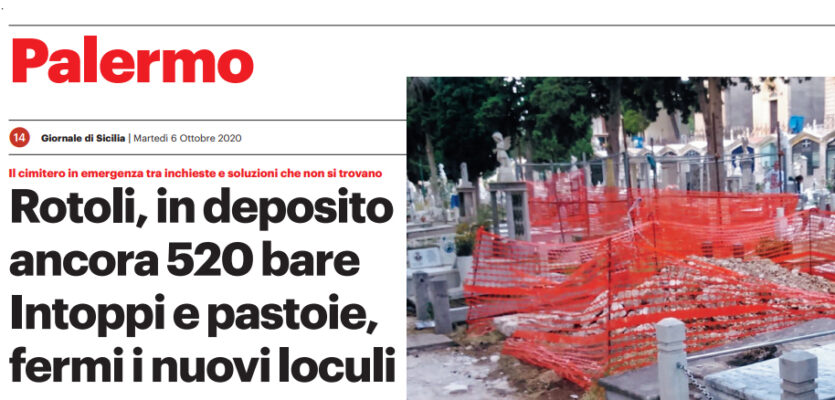 Gds: “Palermo. Il cimitero in emergenza tra inchieste e soluzioni che non si trovano. Rotoli, in deposito ancora 520 bare. Intoppi e pastoie, fermi i nuovi loculi”