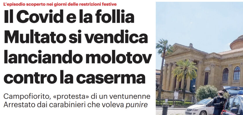 Gds: “Palermo. Il Covid e la follia. Multato, si vendica lanciando molotov contro la caserma”