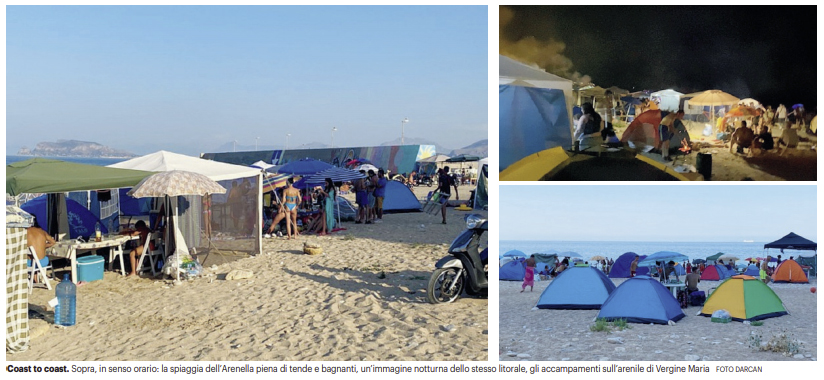Caos, affollamenti, gente assembrata sotto le tende vietate, gazebo improvvisati, vere e proprie tendopoli a Vergine Maria (dove sarebbe pure vietato fare il bagno) come all’Arenella. Il caos, insomma. Controlli il cronista non ne ha visti. Stesse scene a Romagnolo e di sera è l’anarchia più totale, tra falò liberi anche se proibiti e grigliate selvagge. Come se nulla fosse, anche il bagno a mezzanotte e le tende dove provare a dormire fino all’alba.