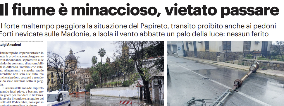 Il maltempo ha imperversato ieri in tutta la provincia, con pioggia e neve in abbondanza, soprattutto sulle Madonie, con tanto di automobilisti in difficoltà. Tombini che saltano, allagamenti, e stavolta strade interdette non solo alle auto, ma anche ai pedoni, costretti a scendere da scale scivolose sotto la pioggia.