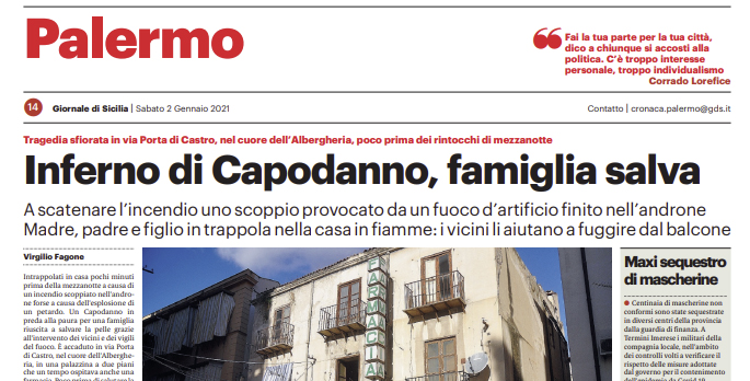 Gds: “Palermo. Inferno di Capodanno, famiglia salva. A scatenare l’incendio uno scoppio provocato da un fuoco d’artificio finito nell’androne. Madre, padre e figlio in trappola nella casa in fiamme. I vicini li aiutano a fuggire dal balcone”