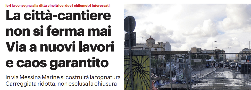 In arrivo nuovi cantieri su via Messina Marine. Ieri, infatti, sono stati consegnati i lavori per la realizzazione della rete fognaria a sistema separato che rientrano nel più ampio programma di sistemazione della condotta comunale. E non sono gli unici in una città dai mille cantieri aperti dei quali si conosce la data d’inizio dei lavori ma non quella della loro conclusione, che viene procrastinata negli anni.