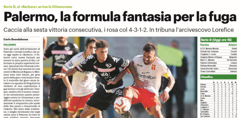 L’edizione odierna de “Il Giornale di Sicilia” analizza quelle che saranno le scelte di Rosario Pergolizzi in merito alla gara di questo pomeriggio contro la Cittanovese. Sembra che il tecnico – si legge – sia intenzionato a cambiare in attacco introducendo il trequartista dietro le punte rinunciando così al tridente. Pergolizzi proverà a migliorare l’incisività di una squadra che finora ha vissuto principalmente sui cross di Felici, Santana e Vaccaro e che forse potrebbe sfruttare meglio alcune potenzialità. La prima è proprio Felici, che partendo molto largo spesso si perde in faticosi slalom e arriva alla conclusione senza forze. Giocando più al centro sulla stessa linea di Ricciardo il giovanissimo romano avrebbe più possibilità di battere a rete. Ma un 4-3-1-2 può valorizzare le qualità di altri due giovani che finora hanno fatto bene ma che potrebbero fare meglio: Ambro e Kraja. Con questo cambio modulo che ha intenzione di adottare Pergolizzi, dovrebbe farne le spese Ficarrotta, l’«eroe» di Messina, che di mestiere fa l’attaccante esterno. Quanto visto durante la settimana dice che oggi partirà dalla panchina. Senza contare – conclude il quotidiano – che Sforzini non è certo venuto a Palermo per fare da comprimario.