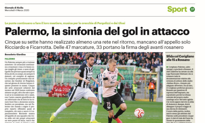 L’edizione odierna del “Giornale di Sicilia” esalta le prestazioni offensive del Palermo. Cinque dei sette attaccanti schierati dal tecnico nel 2020 hanno realizzato almeno un gol, cifra che sale a quota sei se si considerano reti e assist. E’ un paradosso, ma manca all’appello il capocannoniere Ricciardo. Delle 47 reti messe a segno dai rosa in campionato, sono 33 quelle realizzate dagli attaccanti. E’ nella seconda parte della stagione che il Palermo si sta spingendo più avanti. Delle 18 reti realizzate nel 2020, sono 13 quelle segnate dalle punte. A Pergolizzi rimane soltanto da recuperare il suo bomber, in avanti non gli mancano alternative o certezze.