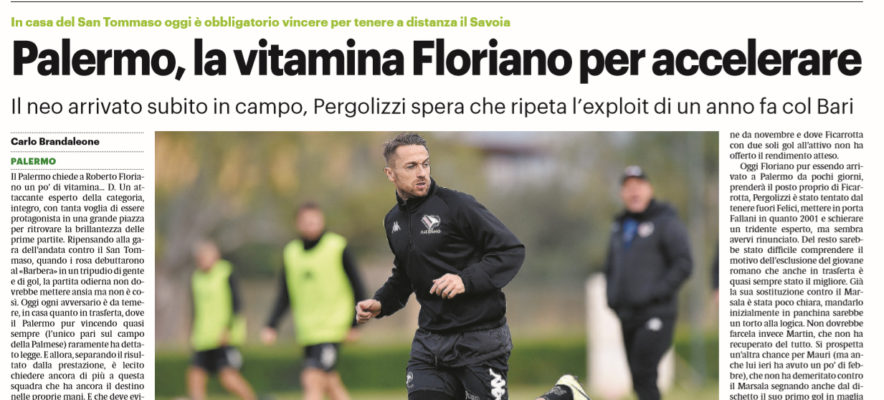 L’edizione odierna del “Giornale di Sicilia” si sofferma sull’innesto di Floriano. Il Palermo chiede un po’ di vitamina al classe ’86, considerando che deve vincere sempre per tenere a distanza il Savoia. Domani, i campani a Castrovillari non avranno vita facile, ma adesso è di fondamentale importanza battere questo San Tommaso che non vince in casa dal 29 novembre, che arranca al penultimo posto in classifica e che insieme al Corigliano possiede la peggiore difesa del campionato avendo subito 37 gol.