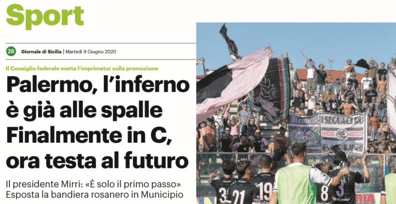 L’edizione odierna del “Giornale di Sicilia” parla della promozione del Palermo in serie C arrivata ieri dopo il Consiglio Federale. «La Serie D è una categoria ricca di dignità e passione, ma che non ha nulla a che fare con 120 anni di orgoglio rosanero». È con queste parole che il presidente Mirri rende pubblica la propria soddisfazione per l’obiettivo raggiunto. «Per questo – prosegue – oggi siamo tutti più forti, più sicuri di noi, più determinati che mai. Lo stesso senso di responsabilità che ci ha portato fin qui ripartendo da zero, ci guida ora nei prossimi passi, sul campo e fuori. Stiamo crescendo tutti insieme, una comunità di persone, prima