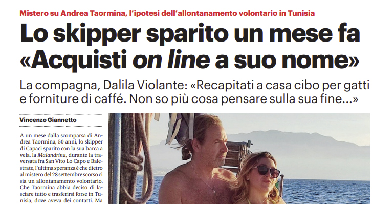 L’edizione odierna de “Il Giornale di Sicilia” torna a scrivere dello skipper scomparsi circa un mese fa. Sulla vicenda spunta qualche novità.