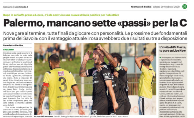 L’edizione odierna del “Giornale di Sicilia” analizza il cammino promozione del Palermo. L’obiettivo finale dista al massimo 21 punti. Sette vittorie con nove partite da giocare, nulla di realmente semplice, ma anche la consapevolezza di potersi permettere ancora un passo falso. Anche perché, dall’altro lato, per scalfire queste certezze servirebbe un rendimento da record del Savoia. Adesso il Palermo ha tra le mani la chance di reagire subito e può iniziare da qui l’ultimo tratto del percorso che deve avere un solo traguardo: quello della Serie C. I 60 punti raccolti finora sono perfettamente in linea con quelli ottenuti da chi, negli anni passati, ha vinto il torneo in carrozza, ma gli uomini di Pergolizzi possono cercare di ridurre i tempi per chiudere in fretta questa corsa al ritorno tra i professionisti. Nola e Corigliano, ovvero le prossime due gare di campionato, rappresentano due occasioni enormi per portare a casa i primi sei punti. Poi il calendario smetterà di essere un alleato, ma la posizione dei rosa è di assoluto vantaggio. Per non intaccare la tabella è fondamentale tenere vivo il +7 dai campani.