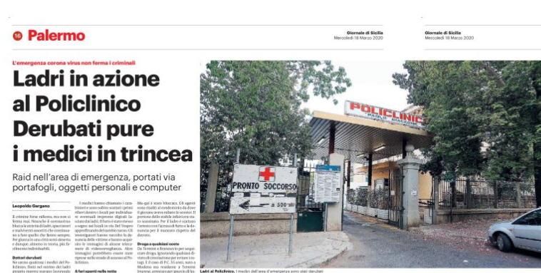 L’edizione odierna del “Giornale di Sicilia” si sofferma sulla criminalità nel bel mezzo dell’emergenza Coronavirus. Neanche il coronavirus blocca le attività di ladri, spacciatori e malviventi assortiti che continuano a fare quello che fanno sempre. Per giunta in una città semi-deserta e dunque, almeno in teoria, più facilmente individuabili. Ne sanno qualcosa i medici del Policlinico, finiti nel mirino dei ladri proprio mentre stavano lavorando in un momento di grande emergenza nazionale. Nei confronti di dottori e infermieri chiamati in prima linea bisognerebbe avere un atteggiamento diverso, ma la questione a quanto pare non riguarda affatto i «soliti ignoti» che sono entrati lunedì pomeriggio negli spogliatoi e negli ambulatori del reparto di Medicina d’urgenza del Policlinico. In pochi minuti hanno arraffato tutto quello che avevano a portato di mano, prendendo soldi, portafogli e altri effetti del personale medico. Ma non erano ancora soddisfatti, così hanno cambiato piano e sono entrati anche dentro un ufficio, rubando computer e altro materiale informatico. «Abbiamo trovato tutto sottosopra. La collega arrivata per la notte – racconta uno dei sanitari – non ha trovato lo zaino con le chiavi di casa e della macchina. Io e un’altra collega il portafogli. Poi abbiamo scoperto che sono entrati anche al piano di sotto portando via cinque computer e altra attrezzatura». Un giovane di 30 anni è stato bloccato nel cuore della notte dagli agenti del reparto mobile della polizia mentre stava tentando di rubare uno scooter elettrico in via Vincenzo Errante. Da Termini a Brancaccio per acquistare droga. Ignorando qualsiasi divieto di circolazione per evitare i contagi. È il caso di P.C. 35 anni, nato a Modena ma residente a Termini Imerese, arrestato per spaccio di hashish e segnalato alla magistratura perché girava per strada senza alcun motivo, tranne quello di acquistare e vendere droga. «Barbieri e parrucchieri dei quartieri popolari continuano a lavorare nonostante il divieto imposto dal decreto del presidente del consiglio dei ministri». La denuncia arriva da Nunzio Reina, responsabile dell’area produzione della Confesercenti regionale. «Sono decine le segnalazioni arrivate alla chat del nostro settore – dice Reina – sappiamo che nei quartieri popolari, in periferia, sono tanti coloro che continuano a svolgere indisturbati l’attività di barbiere e parrucchiere. Alcuni offrono servizi a domicilio, altri aprono le porte del negozio alla clientela e poi chiudono la saracinesca per sfuggire ai controlli. Abbiamo denunciato tutto alle forze dell’ordine».