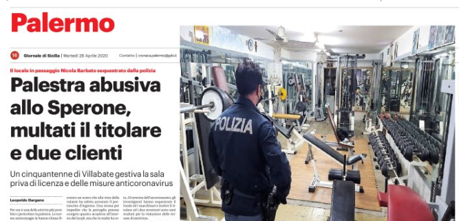 L’edizione odierna del “Giornale di Sicilia” si sofferma sui controlli anti-contagio. Gli agenti del commissariato di Brancaccio hanno scoperto una palestra abusiva nel cuore dello Sperone, senza alcuna autorizzazione e allestita da un 50enne di Villabate. In quel momento si stavano allenando due avventori. Il gestore, secondo l’accusa, non è stato in grado di fornire alcuna giustificazione riguardo l’apertura dell’attività ed ha detto solo che si trattava di una struttura che veniva frequentata dagli amici della borgata. Al termine dell’accertamento, gli investigatori hanno sequestrato il locale ed i macchinari e inoltre il titolare ed i due avventori sono stati multati per la violazione delle misure di antivirus.