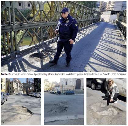 Le voragini colpiscono anche il ponte Bailey, da ieri pomeriggio chiuso per rischio crollo. Un vero e proprio cratere nella carreggiata della struttura militare. Uno squarcio attraverso il quale è possibile vedere il fiume e la vegetazione sottostante. Le prime segnalazioni sono giunte intorno alle 14 di ieri, quando alcuni cittadini hanno ripreso le pessime condizioni in cui versava l’unico punto di collegamento diretto tra il quartiere della Guadagna e gli ospedali cittadini.