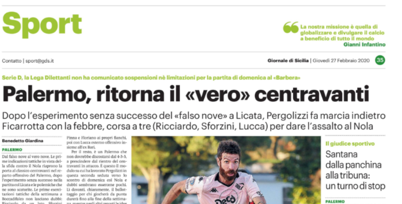 L’edizione odierna del “Giornale di Sicilia” si sofferma sulle possibili scelte del tecnico Pergolizzi in vista della sfida col Nola. Le prime indicazioni riaprono la porta al classico centravanti: Ricciardo, Sforzini e Lucca si contendono l’unico posto a disposizione. Stop precauzionale per Ficarrotta a causa di un attacco influenzale. Ricciardo è a caccia di una maglia da titolare che gli manca dallo scorso 19 gennaio, quando si infortunò nella sfida col Roccella; Sforzini vuole riprendersi il posto che aveva conquistato a suon di gol anche grazie ai problemi muscolari del compagno di reparto e Lucca, che titolare non lo è mai stato, vuole provare al tecnico di essere pronto a giocare anche dal primo minuto, dopo due presenze consecutive da subentrato. Quest’ultimo, però, appare defilato rispetto ai due bomber di maggiore esperienza della squadra rosanero.