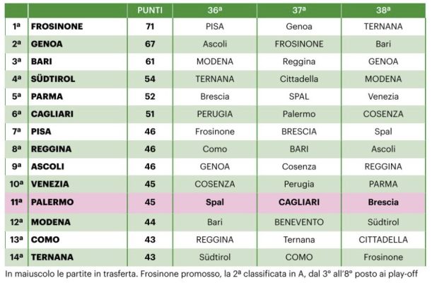Ultime tre gare di regular season e poi il campionato di Serie B emetterà i suoi verdetti. Il Frosinone ha già conquistato la promozione in Serie A e il Genoa potrebbe ottenerla già nel prossimo turno qualora dovesse vincere e il Bari no, oppure qualora i rossoblù di Gilardino dovessero pareggiare e i biancorossi di Mignani perdere. La vera e propria lotta, più che per la promozione dirette è per ottenere un posto nei play-off, dai quali uscirà la terza promossa nella massima serie.