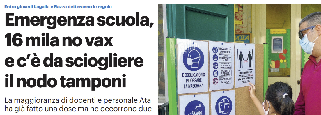 Alla Regione li chiamano mine vaganti. Sono i circa 16 mila, fra docenti e personale Ata, che finora hanno deciso di non vaccinarsi. E sui quali entro giovedì andrà presa una decisione: di sicuro avranno l’obbligo di esibire all’ingresso a scuola almeno il tampone. Ma con quale cadenza va rinnovato? E se non avranno un test anti-Covid valido potranno essere sospesi?