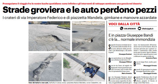 Stesso copione qualche metro più avanti, in via Imperatore Federico, dove un piccolo cratere è l’ultima tappa di un lungo tratto di avvallamenti che mettono a dura prova gli ammortizzatori delle auto. Proprio lì, qualche giorno fa, un cittadino ha perso il copri cerchione dell’auto: «Stavo andando a velocità sostenuta e improvvisamente ho sentito un botto fortissimo», racconta. «Non pensavo fosse successo nulla ma poi dopo aver parcheggiato mi sono accorto di aver perso il copri cerchione», conclude.