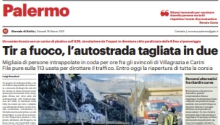Gds: “Palermo. Tir a fuoco, l’autostrada tagliata in due. Migliaia di persone intrappolate in coda per ore fra gli svincoli di Villagrazia e Carini”