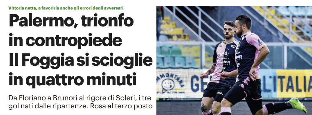 Gds: “Palermo, trionfo in contropiede. Il Foggia si scioglie in quattro minuti”