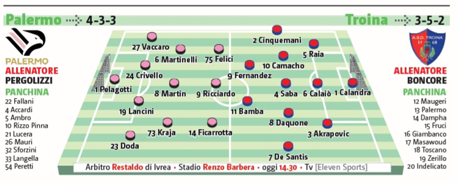 L’edizione odierna del “Giornale di Sicilia” riporta le probabili formazioni di Palermo-Troina. In foto, i ventidue che scenderanno in campo secondo il quotidiano.