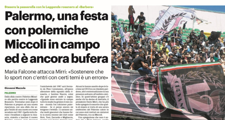 L’edizione odierna del “Giornale di Sicilia” si sofferma sulla sfida tra il Palermo e le vecchie glorie rosanero. L’anello di congiunzione con l’amichevole del 1987 sarà formato da Pino Caramanno, all’epoca allenatore della squadra della rinascita, e Santino Nuccio, colui che segnò in quel giorno: «Quando sono entrato in campo tutto lo stadio ha gridato il mio nome – ricorda l’ex calciatore palermitano – Se ci penso ancora mi vengono i brividi». Ci saranno altri calciatori storici come Ilicic, Toni, Zaccardo, Migliaccio, mentre non hanno risposto positivamente all’invito Belotti, Sirigu, Dybala, Pastore e Cavani. Sarà presente Fabrizio Miccoli, ma la sua partecipazione ha creato diverse polemiche a causa dell’intercettazione in cui insultava il giudice Giovanni Falcone. Alcuni lo hanno assolto, altri contestualizzano la sua presenza soltanto nell’ambito calcistico.