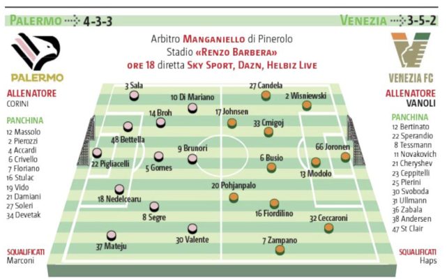 L’edizione odierna de “Il Giornale di Sicilia” si sofferma sulla gara tra Palermo e Venezia in programma oggi e stila le probabili formazioni.