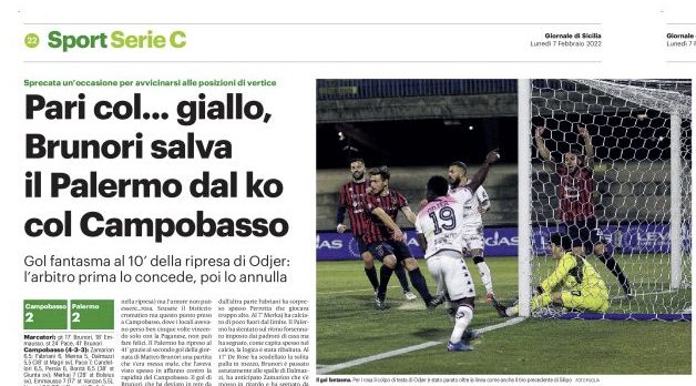 Gds: “Pari col… giallo, Brunori salva il Palermo dal ko col Campobasso”