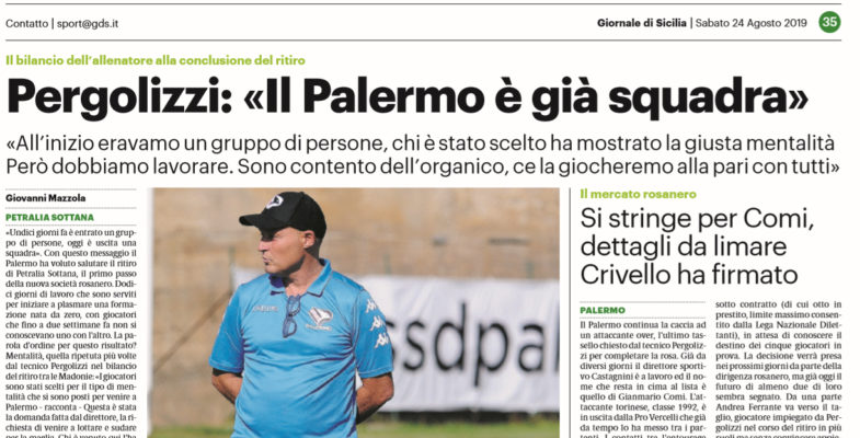 L’edizione odierna del “Giornale di Sicilia” si sofferma sulle dichiarazioni di Rosario Pergolizzi, allenatore del Palermo: «I giocatori sono stati scelti per il tipo di mentalità che si sono posti per venire a Palermo. Questa è stata la domanda fatta dal direttore, la richiesta di venire a lottare e sudare per la maglia. Chi è venuto qui l’ha fatto per il dovere e la voglia che porta giocareper il Palermo. Chi ha scelto divenire qui ha già qualcosa più degli altri. Sono contento di questo ritiro, del luogo dove siamo stati e di come si sono comportati i ragazzi. Sta prendendo forma un’ottima squadra che ha bisogno, però, di lavorare sia sul pianto tattico che sul piano fisico, ma sono sicuro che questo organico potrà fare sicuramente bene. Sappiamo che il nostro obiettivo finale arriverà attraverso un percorso che a volte sarà in salita e a volte in discesa. Dobbiamo affrontarlo nella giusta maniera. Mentalmente i giocatori hanno capito che, per arrivare all’obiettivo, bisogna plasmare il gruppo. Adesso sta andando tutto bene, ma dobbiamo ancora iniziare a giocare. Nei momenti più difficili dovremo avere lo stesso tipo di mentalità ed essere affiatati come nei momenti più belli. A questa squadra manca la corsa, ma non l’aggredire. Nel ripartire non abbiamo ancora la gamba giusta, facciamo fatica quando recuperiamo palla a ripartire. Se ripartiamo in fraseggio ce la facciamo, se ripartiamo su una palla lunga ancora siamo in difficoltà nella ricerca della profondità. Sono contento di quello che ho. Ma la società sa che se ci sarà l’occasione prenderà un altro giocatore. Ce la giocheremo alla pari con tutte. Rispettiamo gli avversari, ma anche noi stessi perché sappiamo cosa possiamo dare. Se in campo faremo vedere il lavoro della settimana, probabilmente avremo qualcosa in più rispetto agli altri».