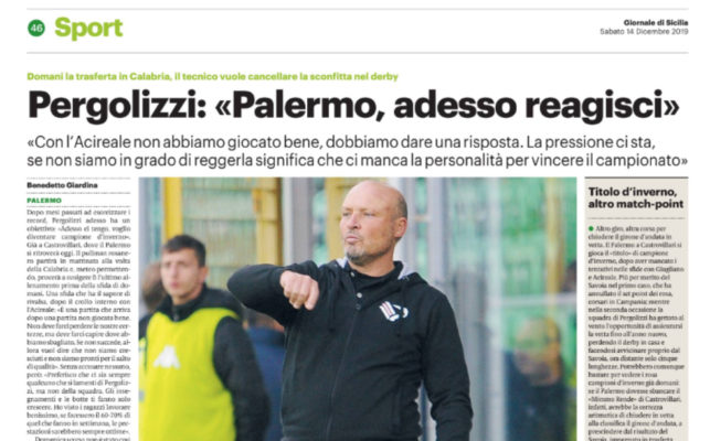 Il Palermo è atteso dal match contro il Castrovillari, una gara che non deve essere sottovalutata dagli uomini di Pergolizzi che si devono rilanciare dopo la sconfitta contro l’Acireale. L’edizione odierna del “Giornale di Sicilia” fa il punto della situazione in casa rosanero e evidenzia le parole rilasciate in conferenza stampa dal tecnico, Rosario Pergolizzi. Il tecnico palermitano ha un suo obiettivo «Adesso ci tengo, voglio diventare campione d’inverno . Di contro ci sarà il Castrovillari che di certo non farà sconti: «È una partita che arriva dopo una partita non giocata bene. Non deve farci perdere le nostre certezze, ma deve farci capire dove abbiamo sbagliato. Se non succede, allora vuol dire che non siamo cresciuti e non siamo pronti per il salto di qualità». Senza accusare nessuno, però: «Preferisco che ci sia sempre qualcuno che si lamenti di Pergolizzi, ma non della squadra. Gli insegnamenti e le botte ti fanno solo crescere. Ho visto i ragazzi lavorare benissimo, se facessero il 60-70% di quel che fanno in settimana,le prestazioni sarebbero sempre ottime». Domenica di certo non è arriva l’ottima prestazione, ma il dubbio che aleggia è che i rosanero possano soffrire i big match :«Non è così – ribatte il tecnico – abbiamo fatto delle cose incredibili e voglio vedere in quante vinceranno in casa del Giugliano. Dopo quella partita, credo abbiano mollato anche loro. Questa squadra, lasciando perdere le due sconfitte che sono diverse tra di loro, non ha sofferto nessuno e ha fatto risultati importanti». A guidare l’attacco ci sarà Gianni Ricciardo, che ritrova il posto da titolare: «È sempre stato un punto di riferimento, di lui non posso lamentarmi perché sta dando tutto quel che può dare, dal primo giorno fino ad oggi». Toccherà a lui portare il peso dell’attacco sulle spalle, senza Santana: «Vorrei che la squadra prendesse la sua figura come uno stimolo per dedicargli la vittoria perché il capitano ha fatto tanto per noi». L’infortunio dell’argentino obbliga il Palermo a muoversi sul mercato, ma la società è più restia «Non abbiamo parlato di mercato,di questo se ne occupa la società e se ce ne sarà necessità, sapranno cosa fare. Se occorre qualcosa che può migliorarci, sono convinto che la società lo farà. Altrimenti è normale che non lo faremo. Abbiamo il tempo per fare tutto, ma per me come allenatore, queste due partite sono importanti». Anche per la propria posizione: «Sono in discussione dal primo giorno, ma io do tutto me stesso emi godo il momento, perché sono fiero di allenare il Palermo. La gente è libera di dire quel che vuole, lo fanno con Sarri, Allegri e Ancelotti». La società non ha alcun dubbio, piena fiducia a Pergolizzi: «Anche perché esonerare un allenatore che ha vinto dodici partite su quindici…». Risultati che spesso vengono offuscati da quelle due sconfitte contro le due principali contendenti, che hanno ridotto il gap dalle inseguitrici a soli cinque punti: «È chiaro, prima erano a dodici punti e adesso sono a cinque, si sono avvicinati. Prima però forse erano troppi punti, ora è un distacco normale». Non abbastanza per poter abbassare la guardia, però. E la pressione che ne deriva può essere anche deleteria: «Se la pressione viene vista come uno stimolo è positiva, altrimenti vuol dire che non abbiamo la personalità per cercare di vincere il campionato e questo non deve succedere».