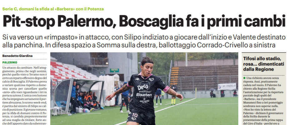 L’edizione odierna del “Giornale di Sicilia” si sofferma sulla sfida fra Palermo e Potenza. Boscaglia prova a variare qualcosa: Silipo si candida prepotentemente ad una maglia da titolare. Palazzi e Odjer verso la conferma, con Martin in panchina e Broh non ancora al pieno della condizione fisica. Non rimane che riproporre il 4-2-3-1. Kanoute è stato provato accanto a Lucca, anche se quest’ultimo resta dietro nelle gerarchie, con Saraniti ancora favorito. Chi rischia di perdere il posto è Valente. Crivello rischia, con Corrado pronto a conquistarsi una maglia.