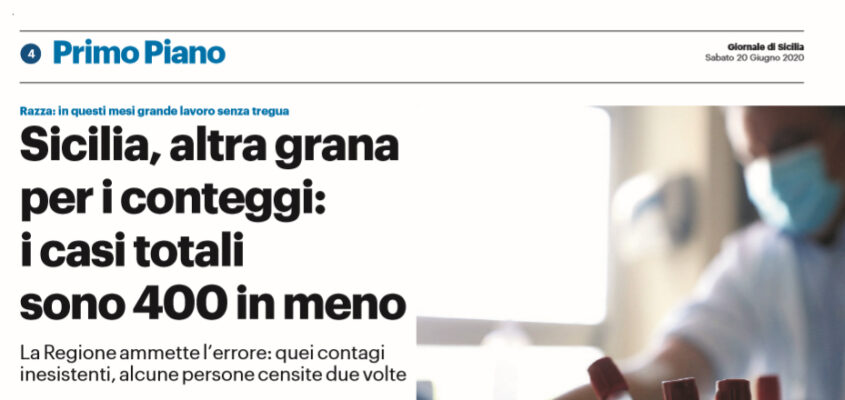 L’edizione odierna del “Giornale di Sicilia” si sofferma sugli errori nei conteggi dei positivi al Covid-19 in Sicilia. Il totale dei contagiati dall’inizio dei controlli non è di 3464 unità ma di 3070, ovvero, sono stati registrati 397 casi in più, per errore. L’assessore regionale alla Salute, via Facebook, ha puntato il dito verso «alcune Asp, in particolare quella di Catania, che oltre a non aggiornare costantemente il numero di guariti, ci comunicavano come nuovi positivi i pazienti che ricevevano il doppio tampone o venivano esaminati da altri laboratori».