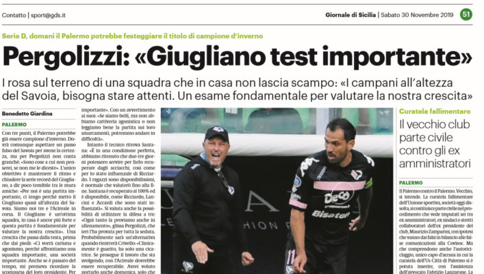 L’edizione odierna del “Giornale di Sicilia” si sofferma sulla sfida tra Giugliano e Palermo. Con tre punti, i rosanero potrebbero già essere campioni d’inverno. Dovrà comunque aspettare un passo falso del Savoia per averne la certezze: «Sono cose a cui non penserei, se non me le diceste. Per noi è una partita importante, ci tengo perché metto il Giugliano quasi all’altezza del Savoia. Siamo noi tre e l’Acireale in corsa. Il Giugliano è un’ottima squadra, in casa è ancor più forte e questa partita è fondamentale per valutare la nostra crescita». Una crescita che passa dalla testa, prima che dai piedi: «Ci vorrà carisma e agonismo, perché affrontiamo una squadra importante, una società importante. Anche se è passato del tempo, mi premeva ricordare la scomparsa del loro presidente. Per noi sarà una partita difficile, ma se la guardiamo sotto l’aspetto agonistico e caratteriale sarà fondamentale. Stiamo cercando di variare per avere un’alternativa alla fase offensiva, per non fare le stesse cose sempre. Ambro domenica ha fatto bene, ma non è importante fare un gran possesso, quanto l’intensità. Potrebbe anche giocare, ma mi piacerebbe che durante la partita ci fossero più inserimenti senza palla, attaccando lo spazio. Stiamo lavorando sotto questo aspetto, non puoi avere la coperta corta. Loro sono molto bravi davanti – prosegue Pergolizzi – si muovono bene con tre attaccanti molto rapidi, tutti mancini e con qualità tecniche. Poi hanno quel carattere che li porta ad essere una buona squadra. I risultati dicono che fuori casa hanno fatto meno bene, se non male, mentre in casa hanno fatto molto bene. Per noi è un banco di prova