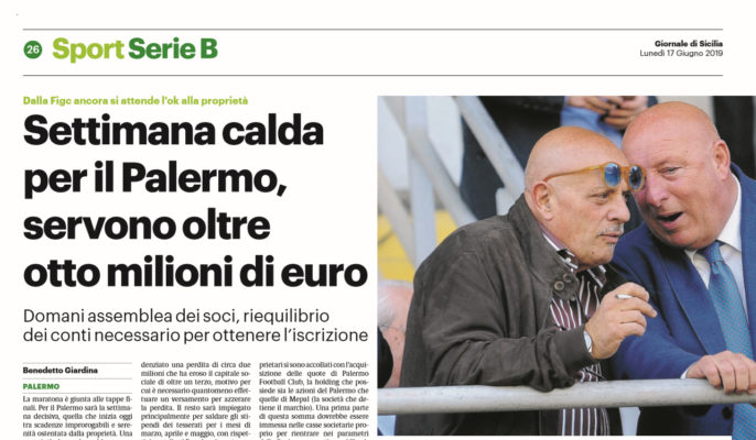 L’edizione odierna del “Giornale di Sicilia” approfondisce la situazione del Palermo, alle prese con la corsa per l’iscrizione al campionato. Si preannuncia una settimana calda. La società attende di essere completamente riconosciuta dalla FIGC e lunedì prossimo dovrà depositare la domanda d’iscrizione al prossimo campionato di Serie B. Questo obiettivo passa dall’assemblea dei soci che si terrà domani: il primo passo formale verso il riequilibrio dei conti del Palermo, che necessita di almeno 8,2 milioni di euro per rientrare nei parametri previsti dalla Covisoc per l’iscrizione. Nonostante Tuttolomondo abbia dichiarato che non sia necessario un aumento di capitale, l’ultima relazione semestrale ha evidenziato una perdita di circa due milioni che ha eroso il capitale sociale di oltre un terzo, motivo per cui è necessario effettuare un versamento per azzerare la perdita. Il resto sarà impiegato per saldare gli stipendi dei tesserati per i mesi di marzo, aprile e maggio, con rispettivi contributi Enpals e ritenute, per circa 5,5 milioni di euro. Il Palermo deve mettersi in pari anche sul fronte debitorio: Sporting Network ha annunciato di essere in grado di ripianare 4,4 milioni di debiti tributari. I conti con i creditori in attesa di soldi da inizio anno non sono ancora stati regolati completamente.