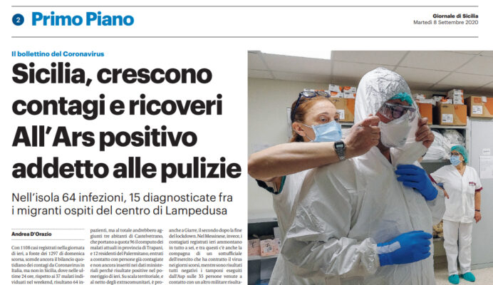 L’edizione odierna del “Giornale di Sicilia” si sofferma sull’emergenza Coronavirus in Sicilia. Tra i nuovi positivi c’è un dipendente dell’impresa che si occupa delle pulizie dei locali dell’Ars, contagiato a seguito di contatti avuti al di fuori dei locali dell’Assemblea. Ai 49 nuovi contagi andrebbero aggiunti tre abitanti di Castelvetrano, che portano a quota 96 il computo dei malati attuali in provincia di Trapani, e 12 residenti del Palermitano, entrati a contatto con persone già contagiato.