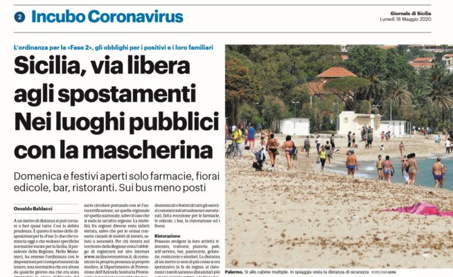 L’edizione odierna del “Giornale di Sicilia” si sofferma sulla Fase 2 in Sicilia. L’ordinanza firmata da Musumeci specifica che è obbligatorio nei luoghi pubblici e aperti al pubblico l’utilizzo di mascherina o altro strumento di copertura di naso e bocca. Per coloro che svolgono attività motoria non è obbligatorio l’uso di mascherina. Si può andare nelle seconde case e si può incontrare chiunque. Viene ridotta la capienza dei mezzi di trasporto pubblico. Possono svolgere la loro attività ristoranti, trattorie, pizzerie, pub, self-service, pasticcerie, gelaterie e rosticceria. Sarà necessario rispettare la distanza di un metro. Sono consentite le attività turistiche, le attività alberghiere ed extralberghiere, compresi gli alloggi in agriturismo, bed&breakfast, villaggi turistici, campeggi, case vacanza e similari, nel rispetto delle Linee guida e delle norme di sicurezza. Dall’8 giugno è permessa l’apertura delle discoteche, teatri e cinema all’aperto