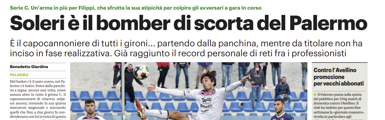 L’edizione odierna de “Il Giornale di Sicilia” si sofferma su Edoardo Soleri e lo definisce bomber di scorta del Palermo.