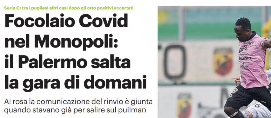 Gds: “Tra i pugliesi altri casi dopo gli otto positivi accertati. Focolaio Covid nel Monopoli, il Palermo salta la gara di domani”