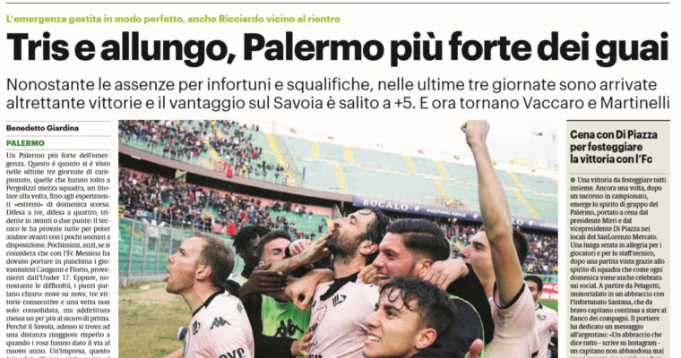L’edizione odierna del “Giornale di Sicilia” si sofferma sul momento del Palermo. La squadra di Pergolizzi si è mostrata più forte dell’emergenza. Difesa a tre, a quattro, tridente in avanti o due punti: il tecnico le ha provate tutte per poter andare avanti con i pochi uomini a disposizione. Nonostante le difficoltà, i punti parlano chiaro: nove su nove, tre vittorie consecutive e una vetta più al sicuro di prima. Il Savoia non è riuscito a sfruttare il match ball col Castrovillari di qualche settimana fa e il Palermo è riuscito ad allungare il distacco nel momento più complicato della stagione. Pergolizzi ha dovuto fare a meno di titolari importanti per infortuni e squalifiche. Un gioco di incastri che finora ha detto bene al Palermo, capace solo di vincere a dispetto delle defezioni.