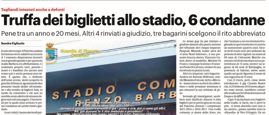 “Erano altri tempi, il Palermo andava fortissimo ed era addirittura in serie A. I rosanero disputavano incontri con le grandi squadre e per questo lo stadio Barbera era affollatissimo. Ci andavano proprio tutti, persino i morti o i bambini che ancora non erano nati e anche persone mai esistite. È questo che, a febbraio dell’anno scorso, aveva scoperto la guardia di finanza, sgominando due presunte bande dedite all’emissione e alla vendita di biglietti falsi, in modo da consentire a chi non ne avrebbe avuto diritto di ottenere degli sconti o di non pagare. Una vicenda perla quale sono arrivate le prime condanne ed i primi rinvii a giudizio. In sei, infatti, hanno deciso di patteggiare con il sostituto procuratore Andrea Fusco, che aveva coordinato l’inchiesta, e con il benestare del gup Fabrizio Molinari, pene (tutte sospese) tra un anno e un anno ed otto mesi. Si tratta del titolare di una ricevitoria di Termini Imerese, Michele Fiaschetto, di due bagarini, Vito ed Antonio D’Angelo, padre e figlio, di Dario e Martina Randazzo, titolari di una ricevitoria di viale Piemonte, nonché di Francesco Puglisi. Lo stesso gup ha poi rinviato a giudizio davanti alla quarta sezione del tribunale altri cinque imputati: Pasquale Minardi, leader ultrà del «Curva Nord Inferiore«, il suo presunto braccio destro, Vincenzo Gulizzi, detto «il modello«, Michele Di Franco, Giuseppe Scavone e Francesco Paolo Di Lorenzo, titolare di una ricevitoria in piazza Leoni. Altri trei mputati, tutti bagarini Andrea ed Antonio Pellicano, nonché Massimo Falcone, detto «Miccoli» – hanno invece scelto il rito abbreviato e nelle prossime settimane il pm avanzerà la sua richiesta di pene. Secondo gli investigatori, sarebbero stati falsificati almeno 4 mila biglietti per le partite giocate in casa dal Palermo durante i campionati 2015-2016 e 2016-2017. Una truffa colossale ai danni dello Stato, ma anche della stessa società sportiva, in cui bagarini, tifosi e titolari di diverse ricevitorie sarebbero stati complici, «tanto- come diceva uno di loro –a Palermo non controlla nessuno». Tanti i trucchi utilizzati per entrare al Barbera: una ragazza di 18 anni sarebbe entrata con un biglietto intestato a un bambino di 11, un uomo di 42 anni con quello di un bimbo mai nato, ma con il suo stesso nome. Per la partita Palermo-Lazio dell’8 aprile 2016 erano stati venduti anche diversi tagliandi intestati a una bambina nata nello stesso giorno dell’incontro e a un’altra nata addirittura il giorno dopo. Per Palermo-Roma del 4 ottobre 2015 era stato invece usato un biglietto con lo sconto riservato agli over 65, solo che l’anziano a cui era intestato il tagliando in quel momento era morto da esattamente quattro anni. Alcuni titoli erano stati poi utilizzati da persone di altre regioni: un uomo di 68 anni di Civitanova Marche era entrato col titolo intestato ad un palermitano di 13 anni, mentre un signore di 60 anni di Battipaglia, in provincia di Salerno, aveva usato quello sul quale figurava il nome di una ragazzina di 12 anni. Con il trucco, però, come aveva sottolineato il gip Claudia Rosini che, il 23 febbraio 2018 aveva disposto nove arresti, sarebbero entrati allo stadio anche tifosi destinatari di Daspo e di diffide. «Qui c’è da rischiare con i biglietti dello stadio,sì rischi,ma ti porti la pila…A farmi duemila euro non ci sto niente», questa sarebbe stata la «filosofia» di Vito D’Angelo. Da un tagliando che costava 2 o 3 euro, come aveva ricostruito la Finanza, se ne potevano ricavare anche 20 o 30. «Quasi 100 euro li hai guadagnati con i biglietti – dicevaF alcone proprio a D’Angelo – però ti devi fare furbo! Io ti do fiducia, il mestiere lo conosco, sono vent’anni che io…Se tu vedi che c’è l’abbondanza di persone…,devi aumentare il prezzo,perché all’ultimo lo volevano pure a 15 o 20 euro, chiedevano biglietti come folli!». Antonino D’Angelo, un altro bagarino, si vantava: «Io tutta Palermo comando!« e per lui i biglietti fasulli sarebbero stati così preziosi che li avrebbe nascosti «nel cassetto, dove ci sono le mutandine, quelle mie…C’è una busta- diceva alla moglie-prendi dieci gradinate e dieci curve»”.