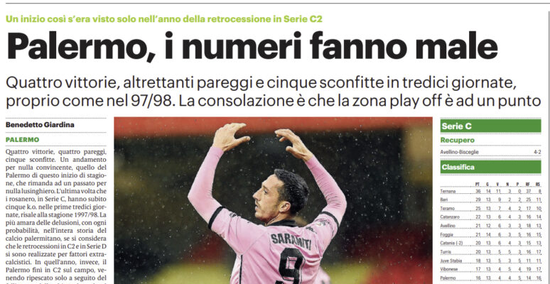Quattro vittorie, quattro pareggi e cinque sconfitte. L’ultima volta che i rosanero, in Serie C, hanno subito cinque k.o. nelle prime tredici giornate, risale alla stagione 1997/98.