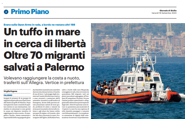 L’edizione odierna del “Giornale di Sicilia” si sofferma sulla protesta di un gruppo di migranti stipati sulla nave Open Arms nel golfo di Palermo. Ieri mattina 76 migranti si sono gettati in acqua nel disperato tentativo di raggiungere la costa a nuoto. Successivamente sono stati tratti in salvo e condotti a terra, per poi essere trasferiti sulla nave quarantena “Allegra”.