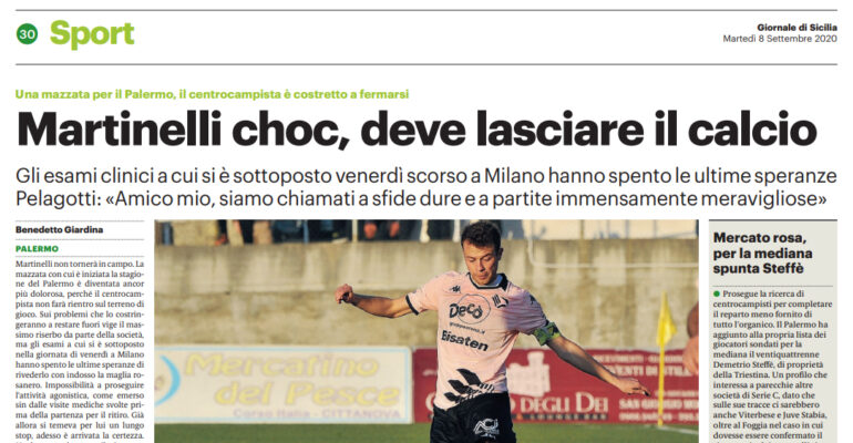L’edizione odierna del “Giornale di Sicilia” si sofferma sullo stop di Alessandro Martinelli. Non tornerà in campo e il Palermo subisce la mazzata. Sui problemi che lo costringeranno a restare fuori vige il massimo riserbo da parte della società. Impossibilità a proseguire l’attività agonistica, questo il risultato degli ultimi esami. Tanta la solidarietà giunta dal mondo del calcio e dall’ambiente rosanero.