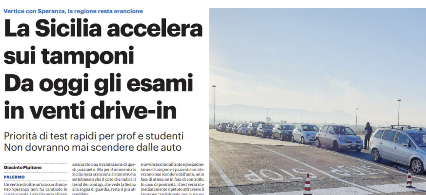 Gds: “Vertice con Speranza, la regione resta arancione. La Sicilia accelera sui tamponi. Da oggi gli esami in venti drive-in”