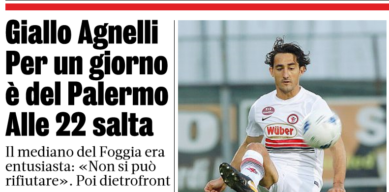 L’edizione odierna della “Gazzetta dello Sport” si sofferma sul giallo Agnelli in casa Palermo. A malincuore, il calciatore ha detto no al Palermo. Problemi di famiglia lo hanno costretto a declinare l’offerta: «Mi dispiace enormemente, la società siciliana ha fatto il possibile, ma per problemi personali ho dovuto rinunciare. Non sarò un giocatore del Palermo quest’anno. Peccato, ammetto che mi sarebbe piaciuto far parte di questo progetto, ma non posso allontanarmi da casa».