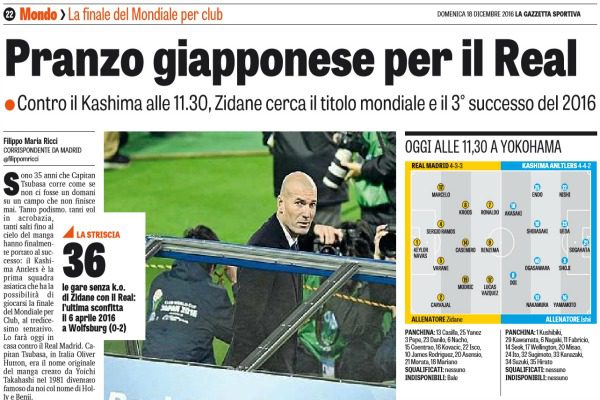 Gazzetta dello Sport: “Pranzo giapponese per il Real. Contro il Kashima alle 11.30, Zidane cerca il titolo mondiale e il 3° successo del 2016”
