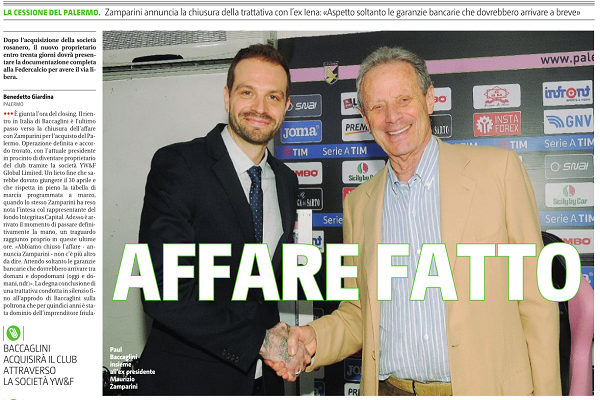 Giornale di Sicilia: “Affare fatto. Zamparini annuncia la chiusura della trattativa con Baccaglini: «Aspetto solo garanzie bancarie»”