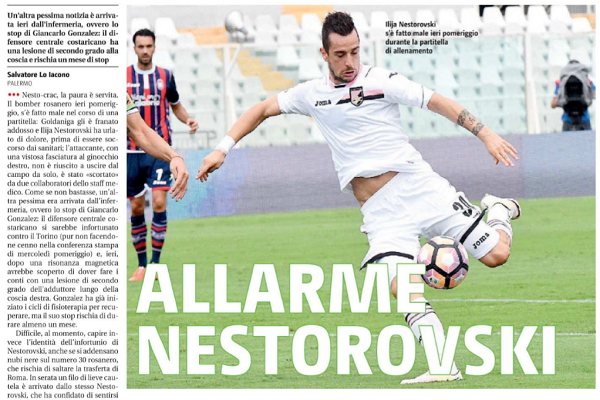 Giornale di Sicilia: “Allarme Nestorovski: il bomber macedone out dopo un contatto con Goldaniga, urlo di dolore e vistosa fasciatura. In dubbio per domenica”