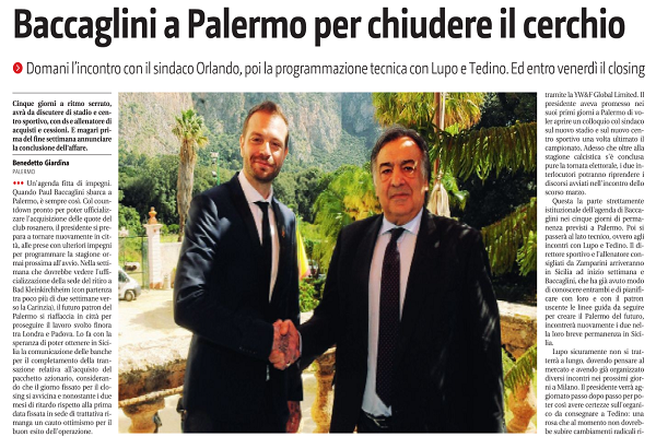 “Un’agenda fitta di impegni. Quando Paul Baccaglini sbarca a Palermo, sempre cosi. Col countdown pronto per poter ufficializzare l’acquisizione delle quote del club rosanero, il presidente si prepara a tornare nuovamente in città, alle prese con ulteriori impegni per programmare la stagione ormai prossima all’avvio. Nella settimana che dovrebbe vedere l’ufficializzazione della sede del ritiro a Bad Kleinkirchheim (con partenza tra poco più di due settimane verso la Carinzia), il futuro patron del Palermo si riallaccia in città per proseguire il lavoro svolto finora tra Londra e Padova. Lo fa con la speranza di poter ottenere in Sicilia la comunicazione delle banche per il completamento della transazione relativa all’acquisto del pacchetto azionario, considerando che il giorno fissato per il closing si avvicina e nonostante i due mesi di ritardo rispetto alla prima data fissata in sede di trattativa rimanga un cauto ottimismo per il buon esito dell’operazione. Baccaglini arriverà in serata a Palermo e domani incontrerà il sindaco Leoluca Orlando. Un appuntamento annunciato dal primo cittadino alla rappresentanza dei tifosi ospitata venerdì scorso al termine della manifestazione che ha raccolto circa cinquecento persone nel corteo di protesta contro gli ultimi sviluppi societari. Un incontro che servirà per fare chiarezza sulla cessione del club e sul ruolo di Maurizio Zamparini nel nuovo organigramrna: di escluso da cariche ufficiali ma presente come “consigliere” del patron. Una posizione che non andata giù a gran parte della tifoseria, al punto da chiedere a gran voce l’intervento delle istituzioni. Ma Baccaglini non parlerà con Orlando solo del futuro societario, questione per la quale fornirà le dovute garanzie sull’acquisizione del cento per cento delle quote tramite la YW&F Global Limited. II presidente aveva promesso nei suoi primi giorni a Palermo di voler aprire un colloquio col sindaco sul nuovo stadio e sul nuovo centro sportivo una volta ultimato il campionato. Adesso che Oltre alla stagione calcistica s’è conclusa pure la tornata elettorale, i due interlocutori potranno riprendere i discorsi avviati nell’incontro dello scorso marzo. Questa la parte strettamente istituzionale dell’agenda di Baccaglini nei cinque giorni di permanenza previsti a Palermo. Poi si passerà al lato tecnico, ovvero agli incontri con Lupo e Tedino. II direttore sportivo e l’allenatore consigliati da Zamparini arriveranno in Sicilia ad inizio settimana e Baccaglini, che ha già avuto modo di conoscere entrambi e di pianificare con loro e con il patron uscente le linee guida da seguire per creare il Palermo del futuro, incontrerà nuovamente i due nella loro breve permanenza in Sicilia. […]”. Questo quanto riportato da “Il Giornale di Sicilia”.