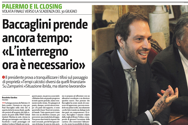 Giornale di Sicilia: “Baccaglini prende ancora tempo: «L’interregno ora è necessario». Il presidente rassicura i tifosi sul closing: «Tempi calcistici diversi da quelli finanziari»”