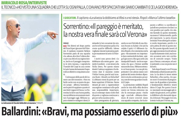 “Visi distesi nel dopo partita del Franchi per i giocatori del Palermo. ll capitano rosanero Stefano Sorrentino parla di una squadra che, adesso, deve fare l’ultimo sforzo per una città ed una regione intera. Anche se il pareggio conquistato in terra toscana, e soprattutto l’harakiri del Carpi in casa contro la Lazio hanno decisamente il sapore di un obiettivo conquistato a metà. Così traspare dalle parole del numero uno dei rossoneri. «Non era facile uscire con un punto da questo campo – afferma Sorrentino anche perché sappiamo quanto siano forti i ragazzi di Sousa. La Fiorentina ha fatto una buona partita, ma noi abbiamo sicuramente meritato il pareggio oggi. «Abbiamo saputo resistere e stringere i denti, limitando le loro occasioni da rete, anche se il loro possesso palla ci ha creato qualche difficoltà. Adesso vogliamo vincere la prossima partita per mantenere in serie A il Palermo». […] Dopo ii fondamentale pareggio contro la Fiorentina, con il Palermo che è riuscito a serrare le fila portando a casa lo 0-0, il tecnico Davide Ballardini elogia in modo convinto i suoi ai culmine di una partita giocata su ritmi bassi., che ha vi- sto la viola di Sousa dominare il gioco per larghi tratti, con i siciiiani che hanno sterilizzato il possesso palla avversario facendo grande densità negli ultimi sedici metri. «Oggi abbiamo raccolto un punto molto importante – commenta l’allenatore – perché ad una giornata dalla fine siamo sopra alla terzultima. Tuttavia c’è ancora una gara molto complessa da disputare: non abbiamo fatto nulla e domenica, contro il Verona, ci giochiamo la salvezza nell’ultimo turno». Poi il tecnico rosanero entra più nel dettaglio: «Devo dire – afferma – che dietro ho visto una squadra molto ordinata ed attenta, abile a chiudere bene gli spazi. Abbiamo fatto esattamente quanto era stato preparato, facendo densità e raddoppiando all’occorrenza, perché conoscevamo le caratteristiche della Fiorentina, squadra molto abile nel possesso palla. Siamo stati bravi, ma possiamo esserlo ancora di più» […]”. Questo quanto riportato dall’edizione odierna de “Il Giornale di Sicilia”.